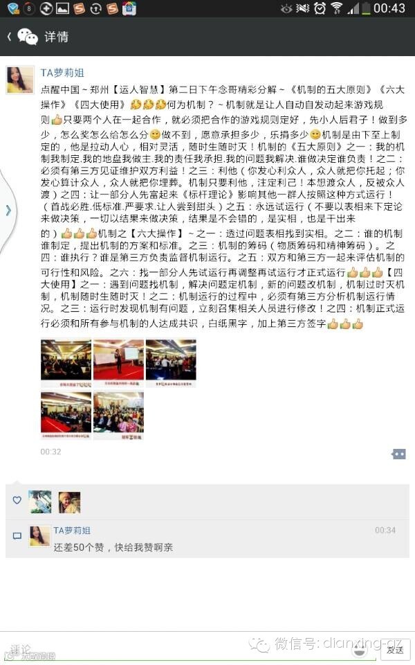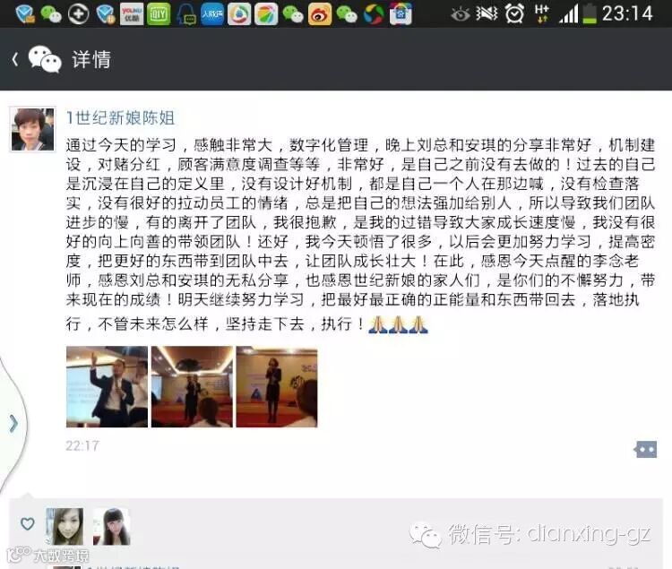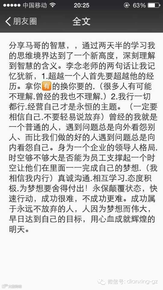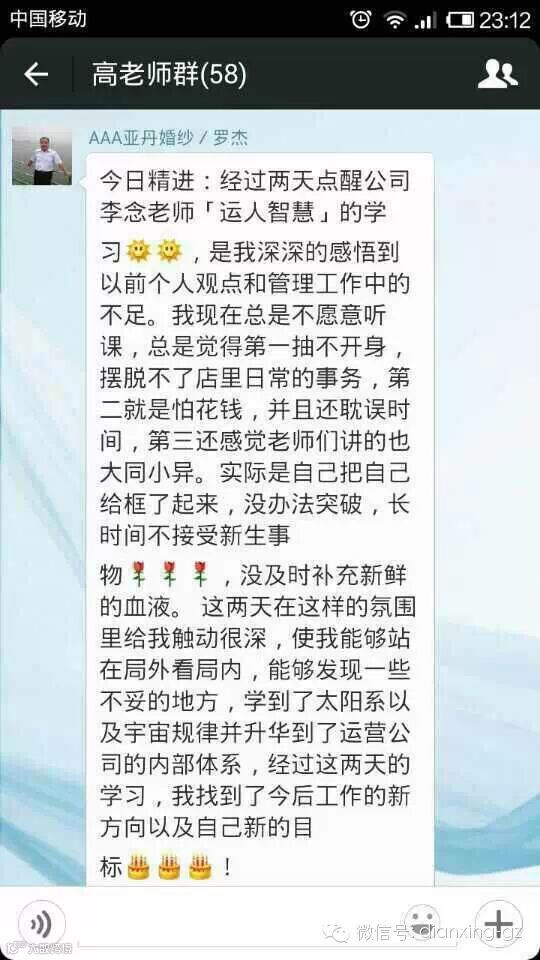 抚顺阁楼李娜9.19日精进:在点醒七天的学习,我真正的从迷茫、困惑、无助中得到了解脱,从此获救!以前我认为只要技术好企业就会运转,从来不知道什么是核心圈,什么是真正的权威,更不清楚如何给员工支起时空,在过去的十年里因为我的不足耽误了多少优秀员工,我今天深深的忏悔,回去后我要先组建我的核心团队,给他们支起一个足够大的时空,因为我已经清楚一个企业没有四樑八柱多么可怕,通过学习我也发现不是没有人才,而是过去我权威丧失,没能给他们支起时空导致他们无法显现。现在我坚信只要我坚定一颗改变的心,一切皆有可能!