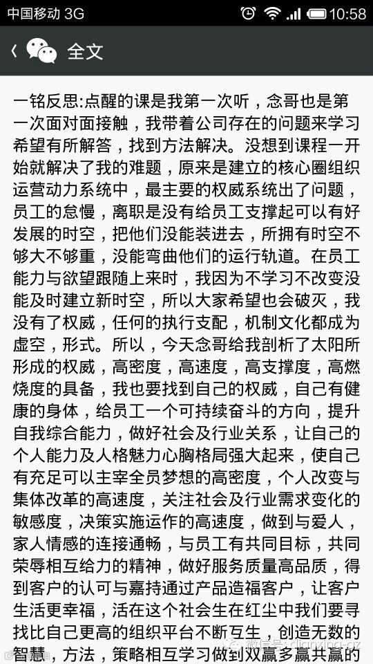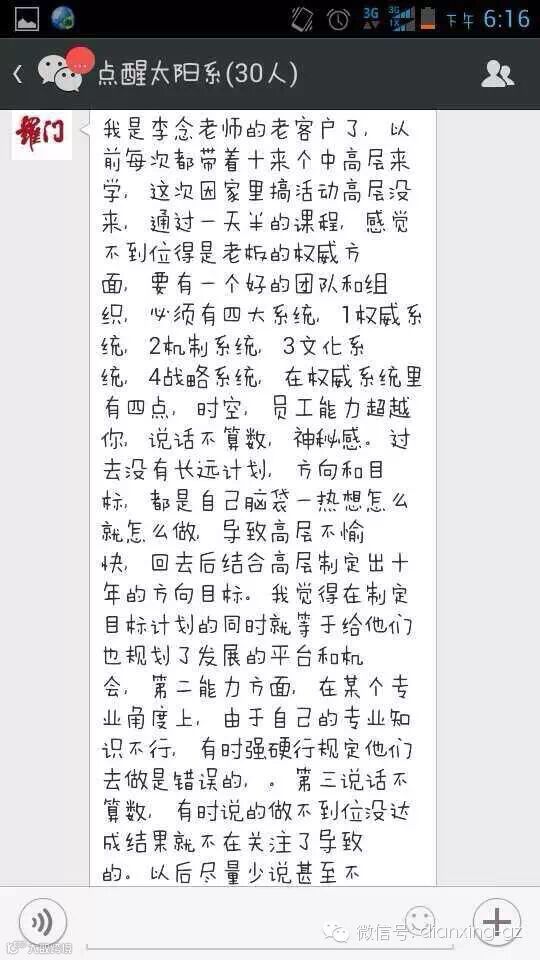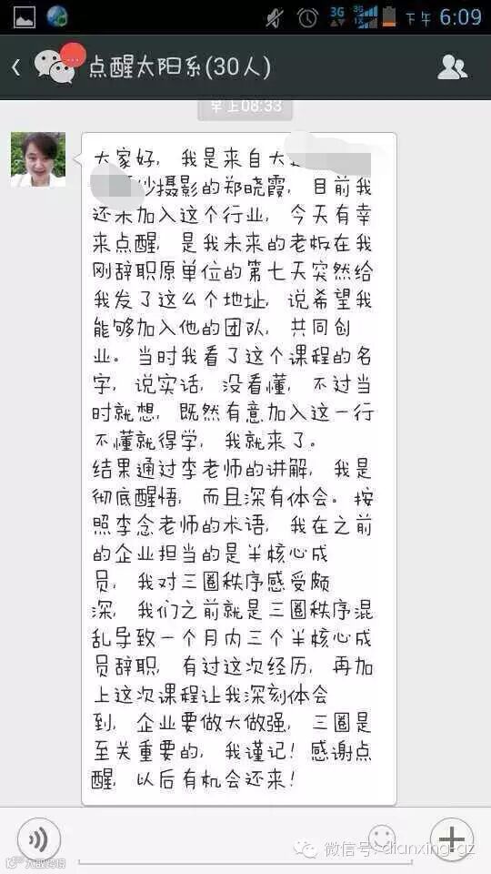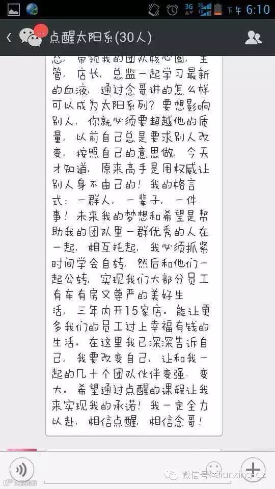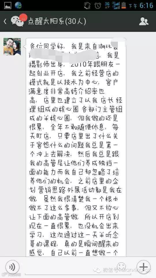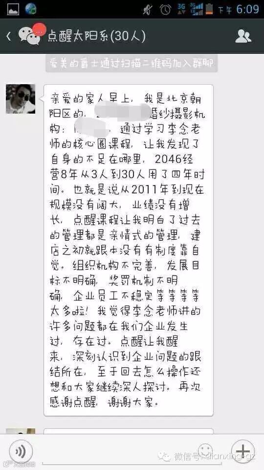 大家好,我是必胜组的于泳海,来自湖北XX,职务是一名店长,在过去的管理模式中一直都是自己在做,因为对下面的主管不放心,怕出错,所有的工作都是自己在安排,每天很累,感觉时间不够用,总是处理完这个部门的事情处理那个部门的事情,就像堵漏一样,将所有主管能做的事情都在自己做,反而将一个店长每日要做的工作给耽误了,导致老板在做我的工作,而我的主管无事可做,通过一天半的学习我忽然发现原来事情是可以这样解决,原来我的主管不是没有用,而是像念哥所说的我压根没有把他们当作我的核心圈的伙伴,没有更多的沟通,自认为高人一等,而没有想过如何让他们和我的频率一致,更多的是插手下面部门的事情,导致主管的权威受损,回去以后我准备和老板沟通,让主管都来学习点醒的课程,让主管的频率和我一致,不再插手部门内部的事情,让每一个部门自己运作,围绕公司核心进行自动运转,下次和我们的主管一起再来学习点醒其他课程,共同进步,彻底解放老板,实现公司自动运转!在此再次感谢李念老师以及点醒公司的所有伙伴!致礼!于泳海。2014年8月17日