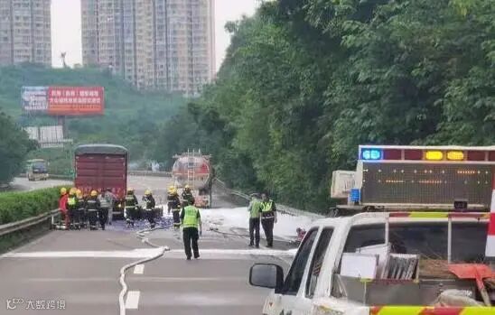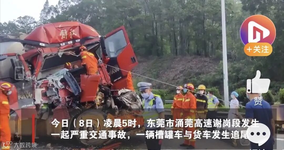 事件:6月8日凌晨5时,东莞市涌莞高速谢岗段发生一起严重交通事故,一辆槽罐车与货车发生追尾。