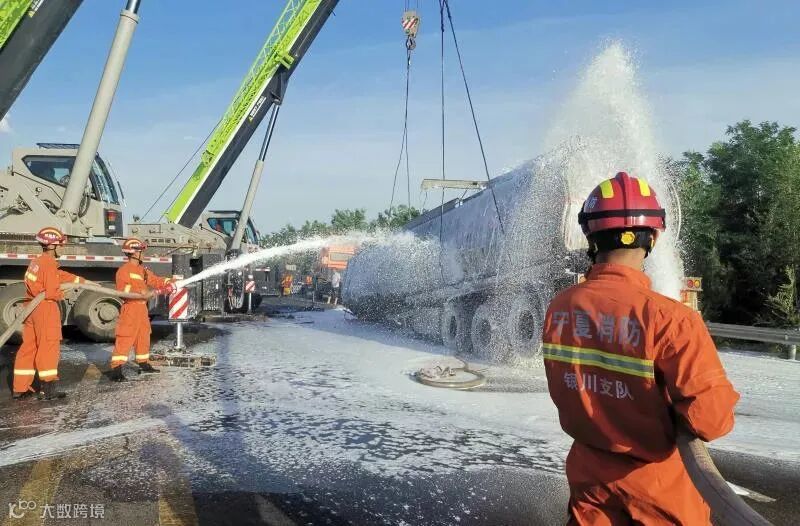 事件:6月8日12时42分,宁夏灵武临河镇永宁黄河大桥出口处发生交通事故,导致装有32吨原油的油罐车侧翻并有一人被困。