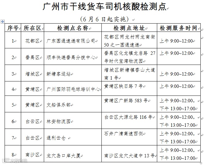 为落实《广州市新型冠状病毒肺炎疫情防控指挥部关于加强离穗车辆和人员管理的通告》(第14号)要求,积极做好货车司机核酸检测工作,广州市已设立货车司机核酸检测点提供免费检测服务。受疫情形势变化影响,以及结合上阶段检测实际情况,现对货车司机核酸检测点和服务时间进行调整,包括整合撤销两个检测点(花都中通和白云大围),以及部分检测点服务时间调整为上午时段(具体检测点及服务时间详见附表)。各检测点6月6日起实施,请货车司机留意核酸检测点调整信息,并现场出示有效身份证、从业资格证和“健康码”绿码进行核酸检测。
