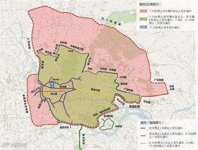 2、全天禁止行驶的路段:内环路及其放射线、洛溪大桥、东风路(中山一立交至南岸路口)、中山路(中山一立交至南岸路口)。