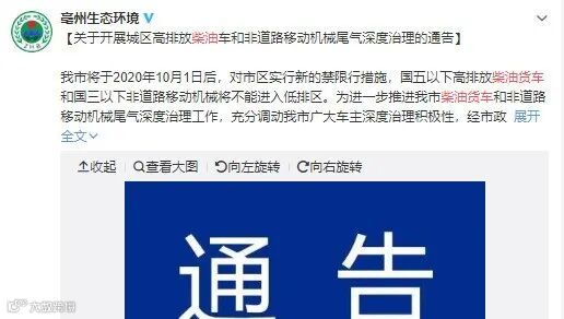 日前,安徽亳州大气污染防治领导小组办公室发出《关于开展城区高排放柴油车和非道路移动机械尾气深度治理的通告》表示:10月1日后,对市区实行新的禁限行措施,国五以下高排放柴油货车和国三以下非道路移动机械将不能进入低排区。