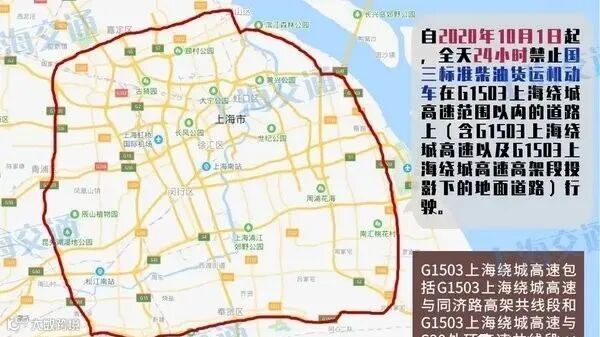 10月1日起,全天24小时禁止国三标准柴油货运机动车在G1503上海绕城高速范围以内的道路上(含G1503上海绕城高速以及G1503上海绕城高速高架段投影下的地面道路)行驶。