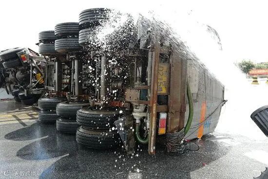 7月7日中午1时48分,广珠高速灵山收费站位置发生一起槽罐车侧翻漏油事故,消防等相关部门及时到场进行处置,事故未造成人员伤亡。当天消防到场查看发现并无人员被困,无起火冒烟等情况。但整个槽罐车车身侧翻后横在路中间,罐体上方盖子损坏,有液体流出,经询问得知该罐体装载的是净水剂并无易燃易爆的危险,车辆油箱由于损坏并持续漏油,消防迅速架设水枪进行降温和稀释,最后由两台吊车对车辆进行扶正。