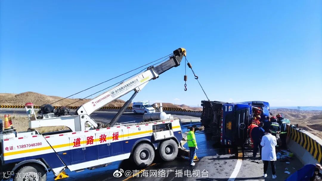青海一油罐车侧翻险些坠入悬崖