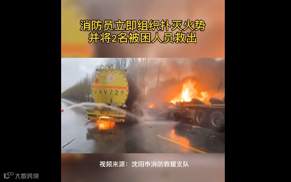 事件:4月12日,辽宁省沈阳市消防接到报警称,新民市乌尔汉村某国道上发生交通事故,两台油罐车爆炸后引燃周围树木,消防员立即扑灭火势。