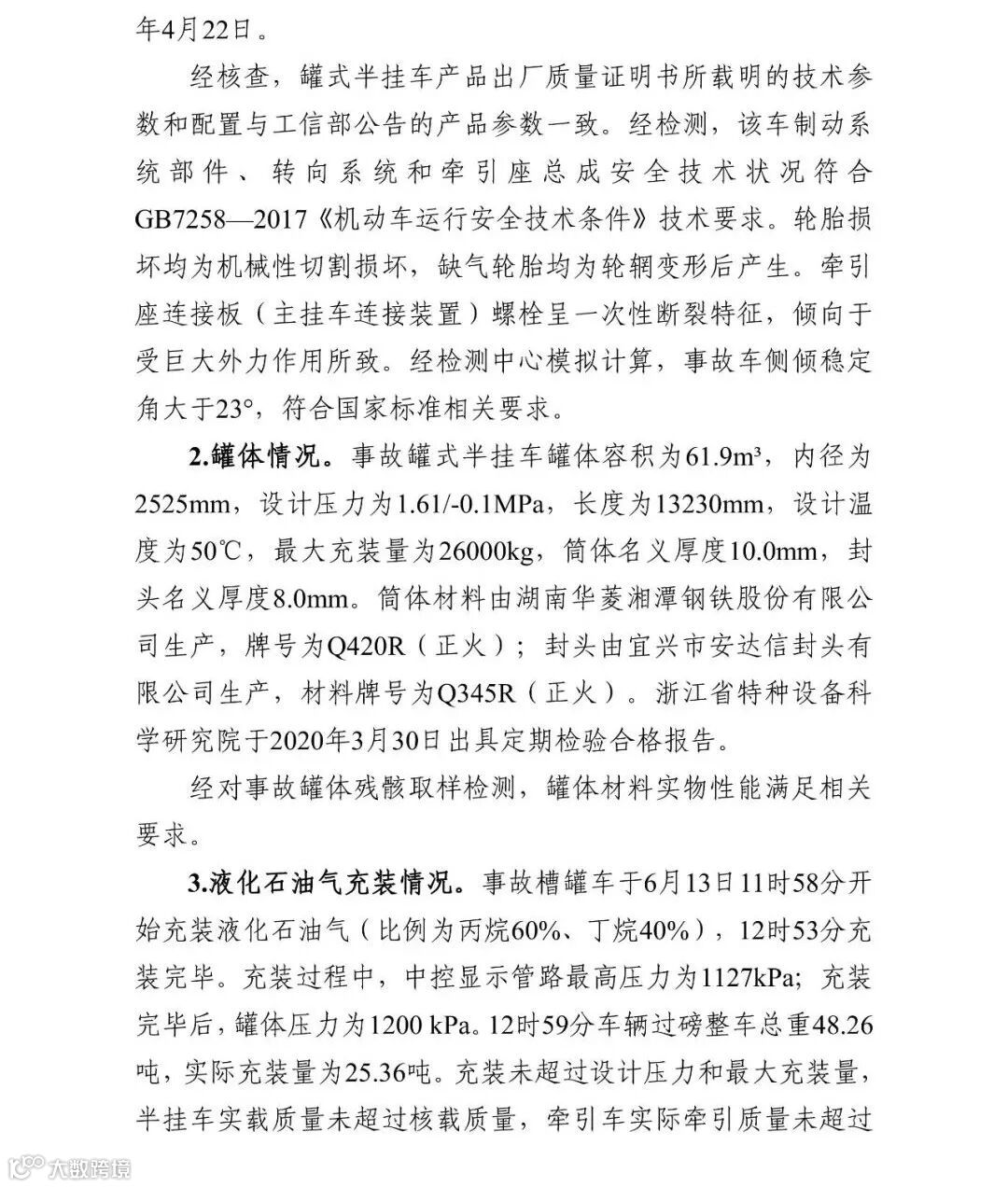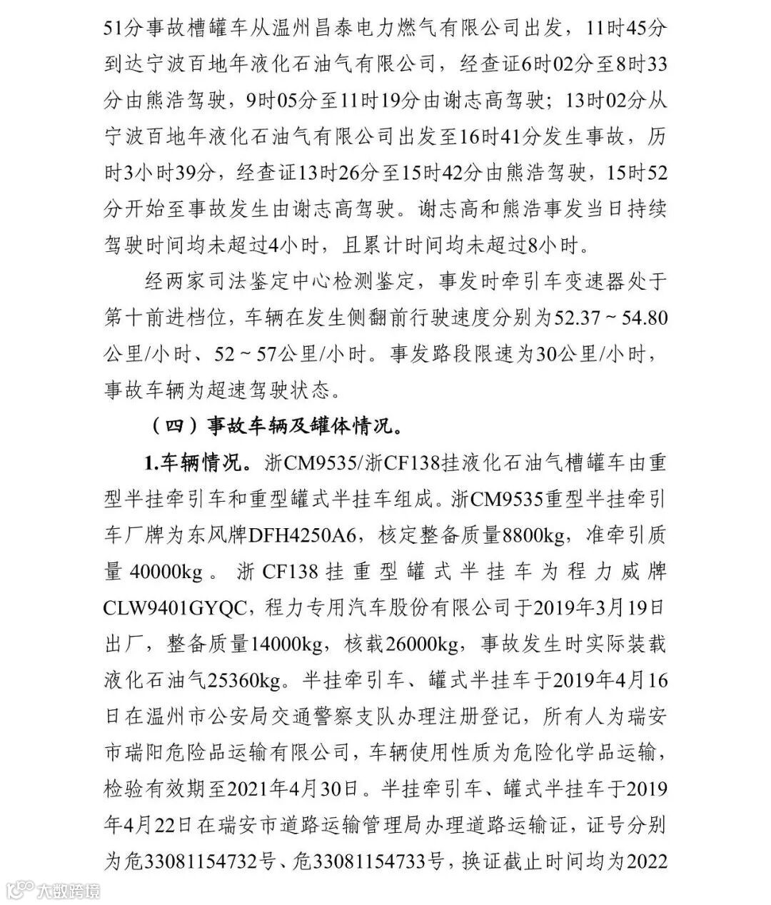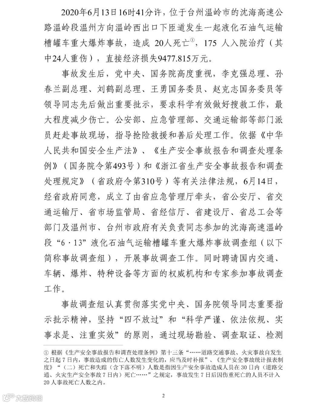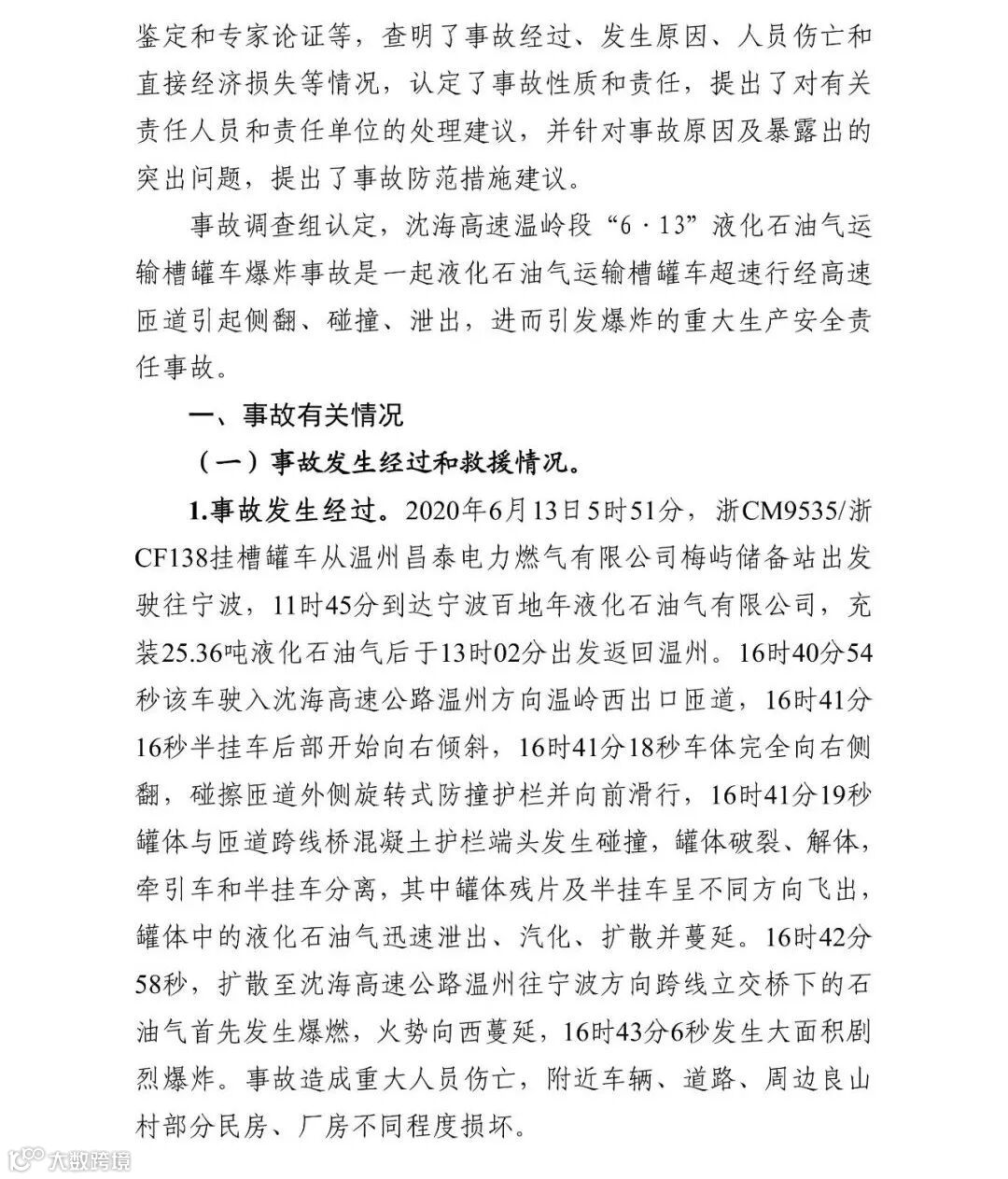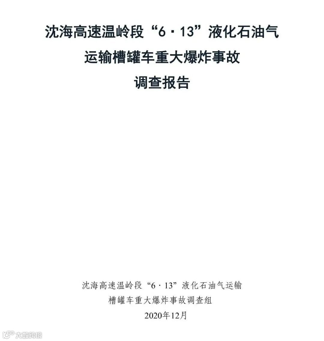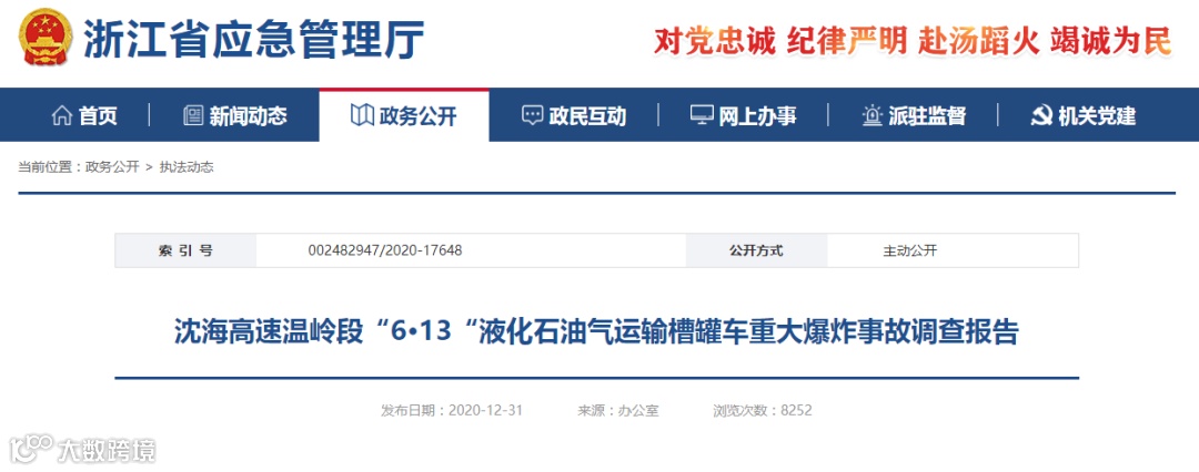 2020年12月31日,浙江省应急管理厅在官网发布了沈海高速温岭段“6·13”液化石油气运输槽罐车重大爆炸事故调查报告。