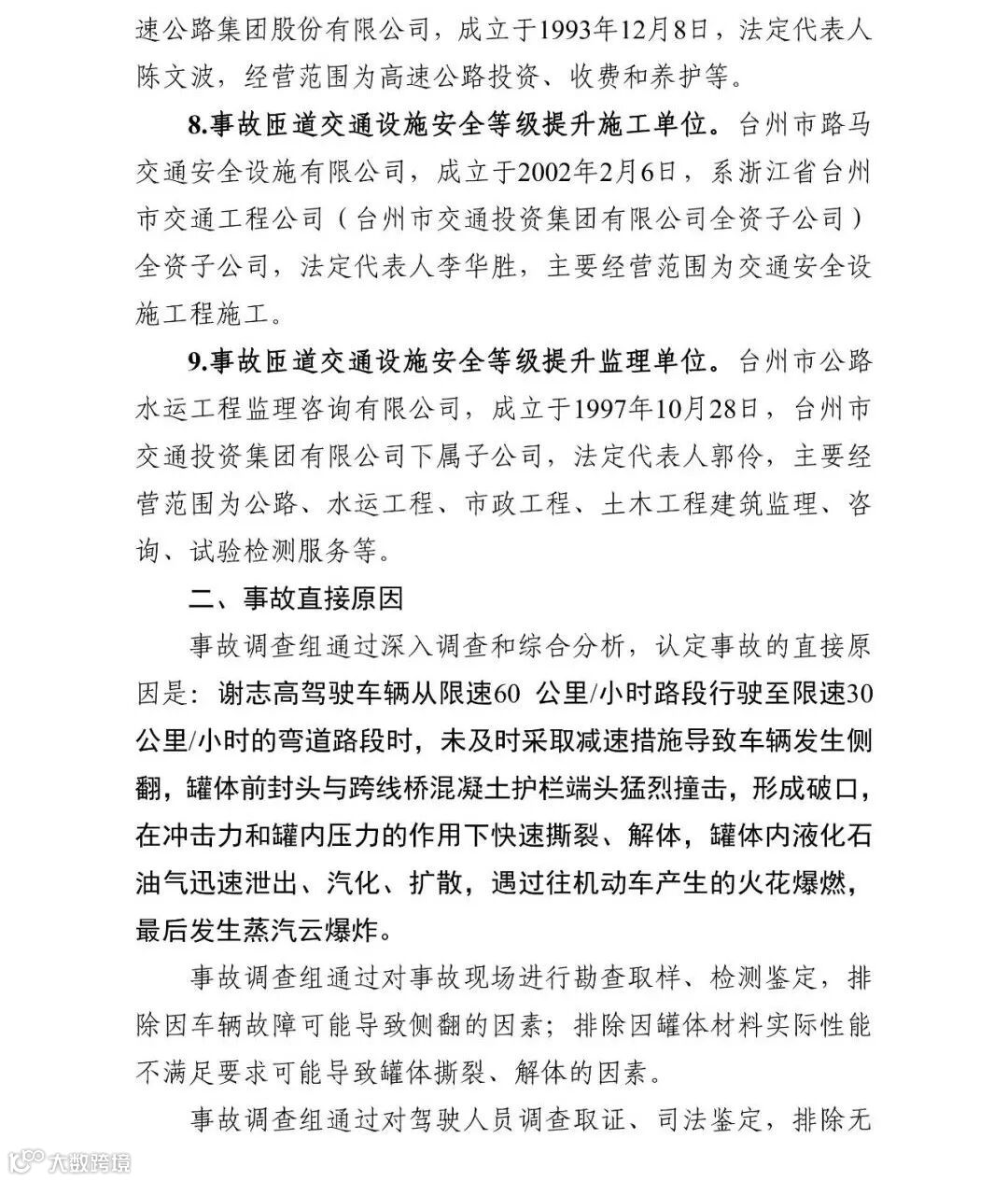 报告指出,事故调查组认定沈海高速温岭段“6·13”液化石油气运输槽罐车爆炸事故是一起液化石油气运输槽罐车超速行经高速匝道引起侧翻、碰撞、泄出,进而引发爆炸的重大生产安全责任事故。