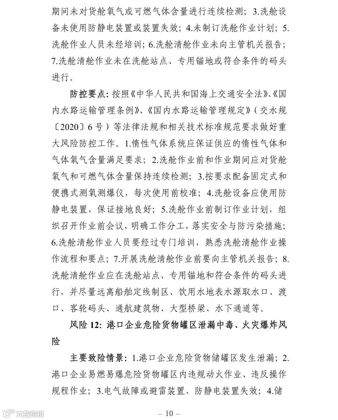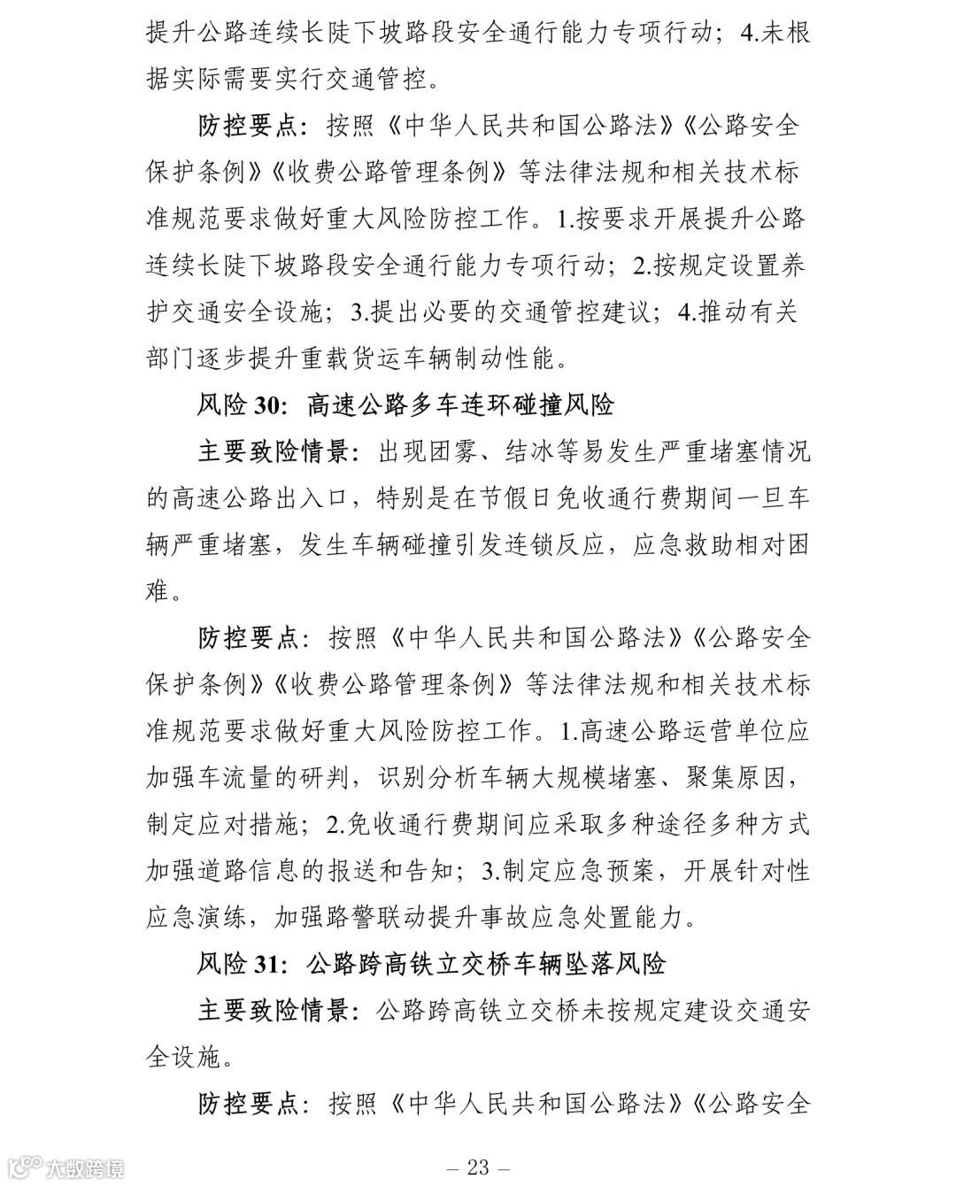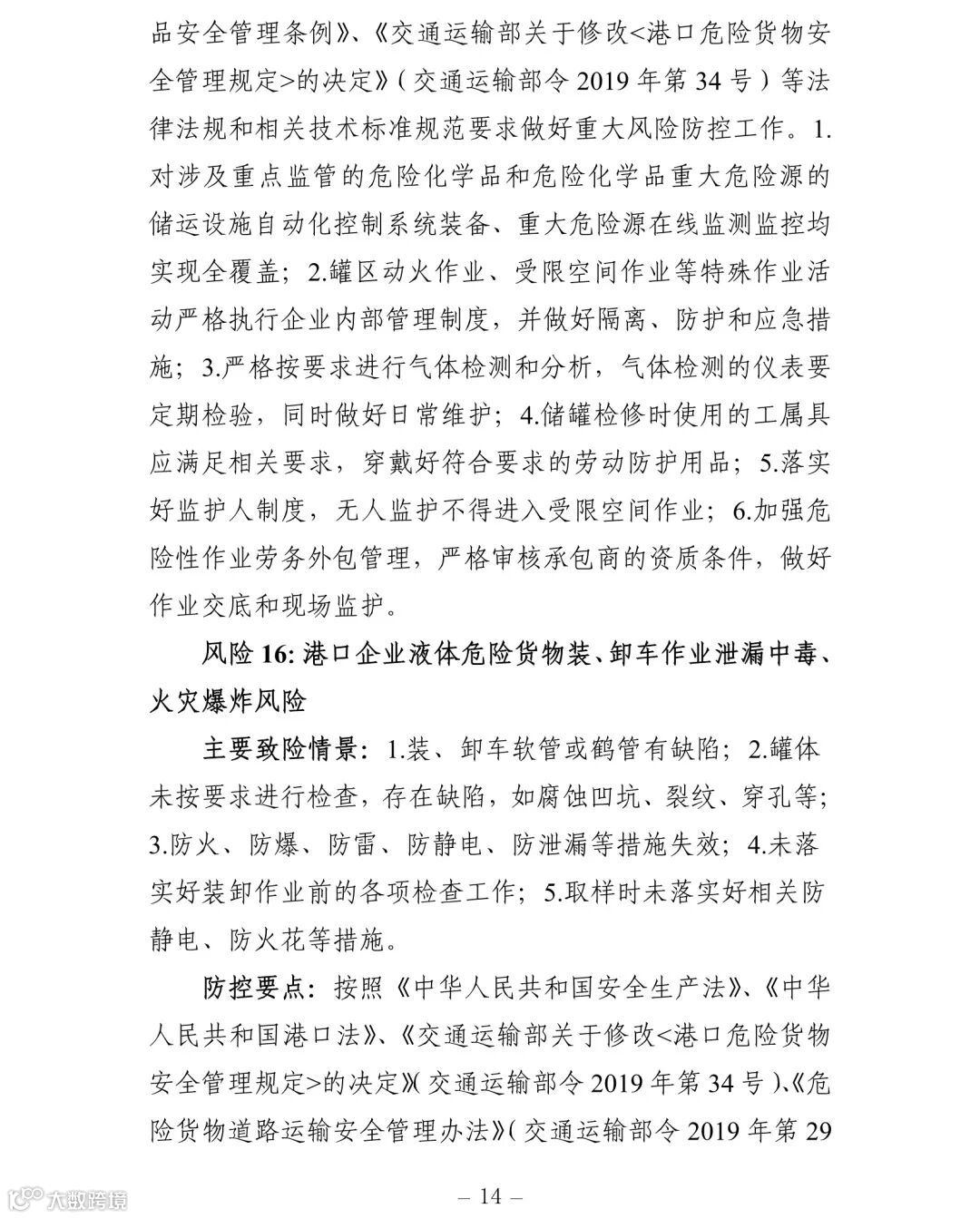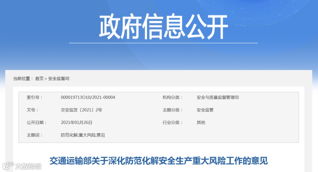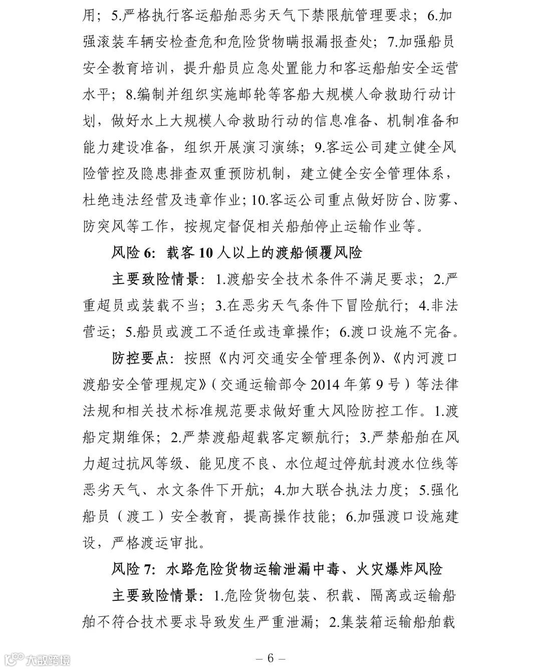 (一)建立健全安全风险研判机制。要认真对照《交通运输安全生产重大风险清单》(见附件)明确的42项重大风险,结合地方实际情况,适时调整和补充重大风险清单,针对行业安全生产风险系统性、区域性、多发性和偶发性特征,加强安全生产形势研判。要围绕行业安全发展变化趋势、环境影响因素、风险规律、事故教训和突出问题等重点,加强调研,定期会商,充分利用大数据等信息化手段,科学研判,及时准确发现潜在重大风险和系统性、区域性、倾向性、苗头性问题,精准提出应对方案和具体措施。
