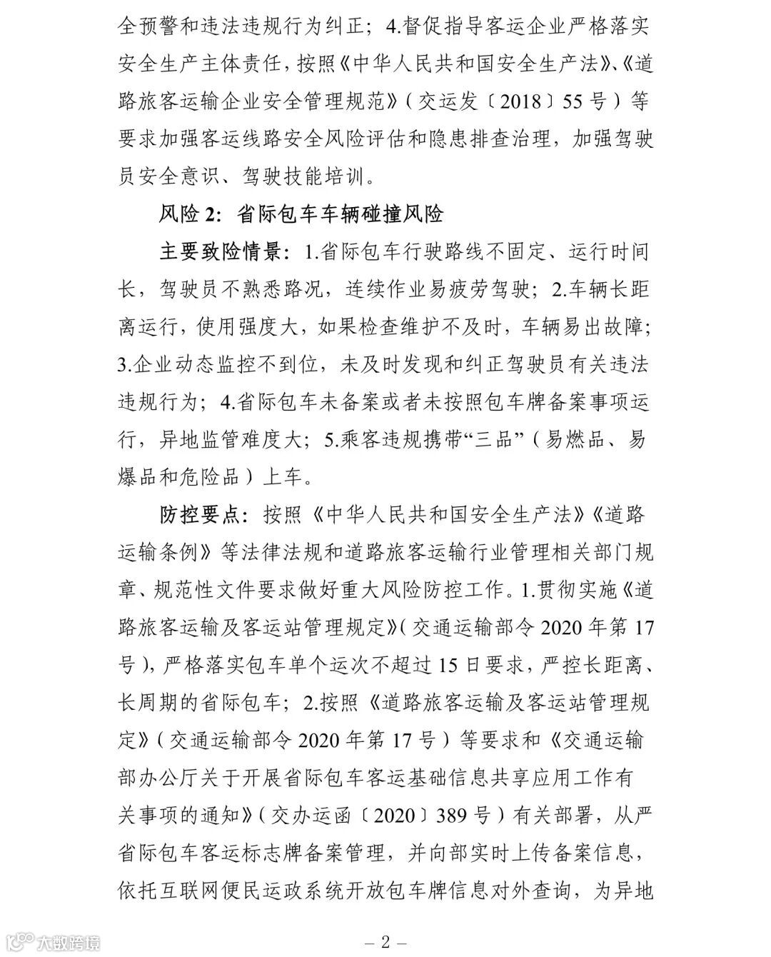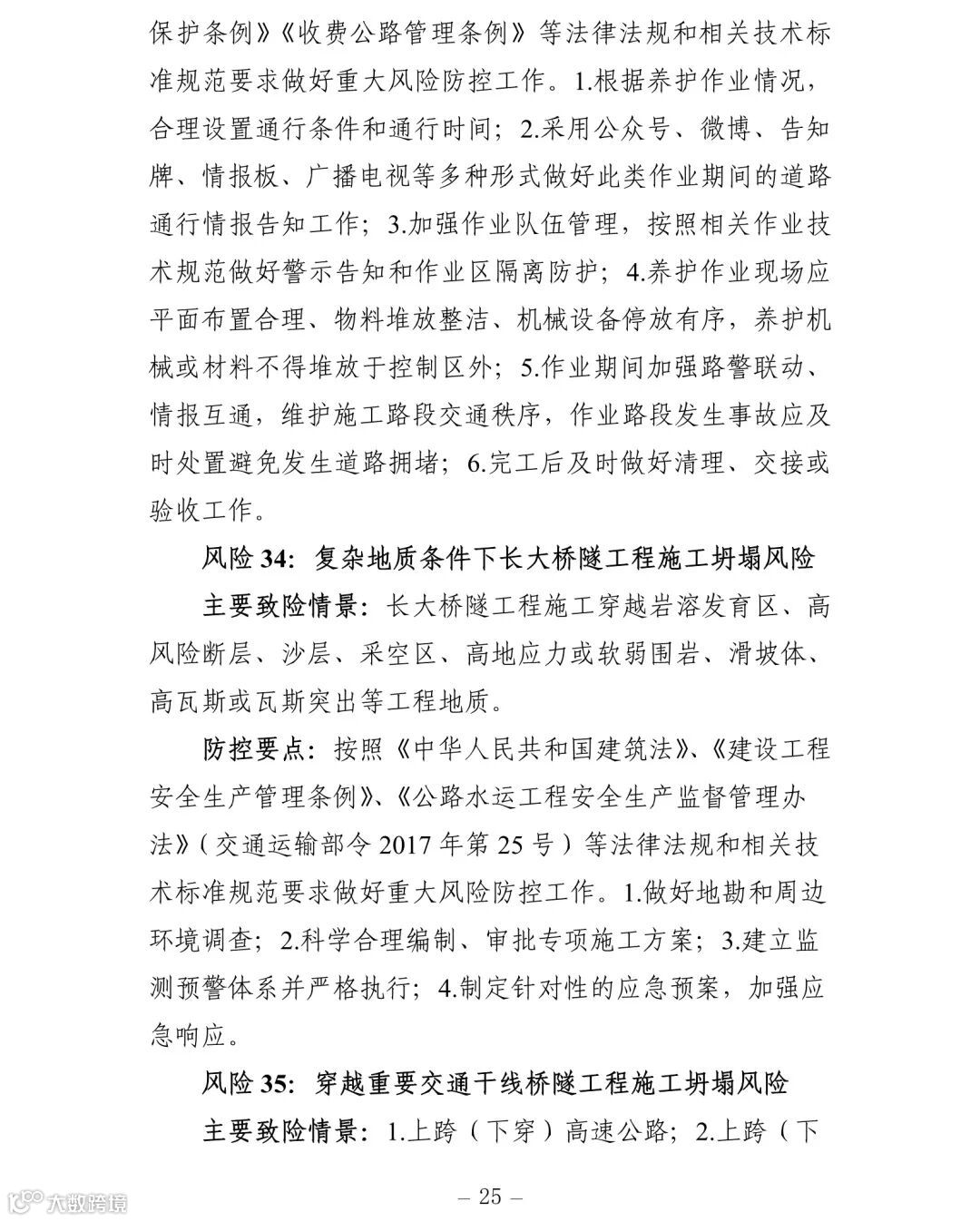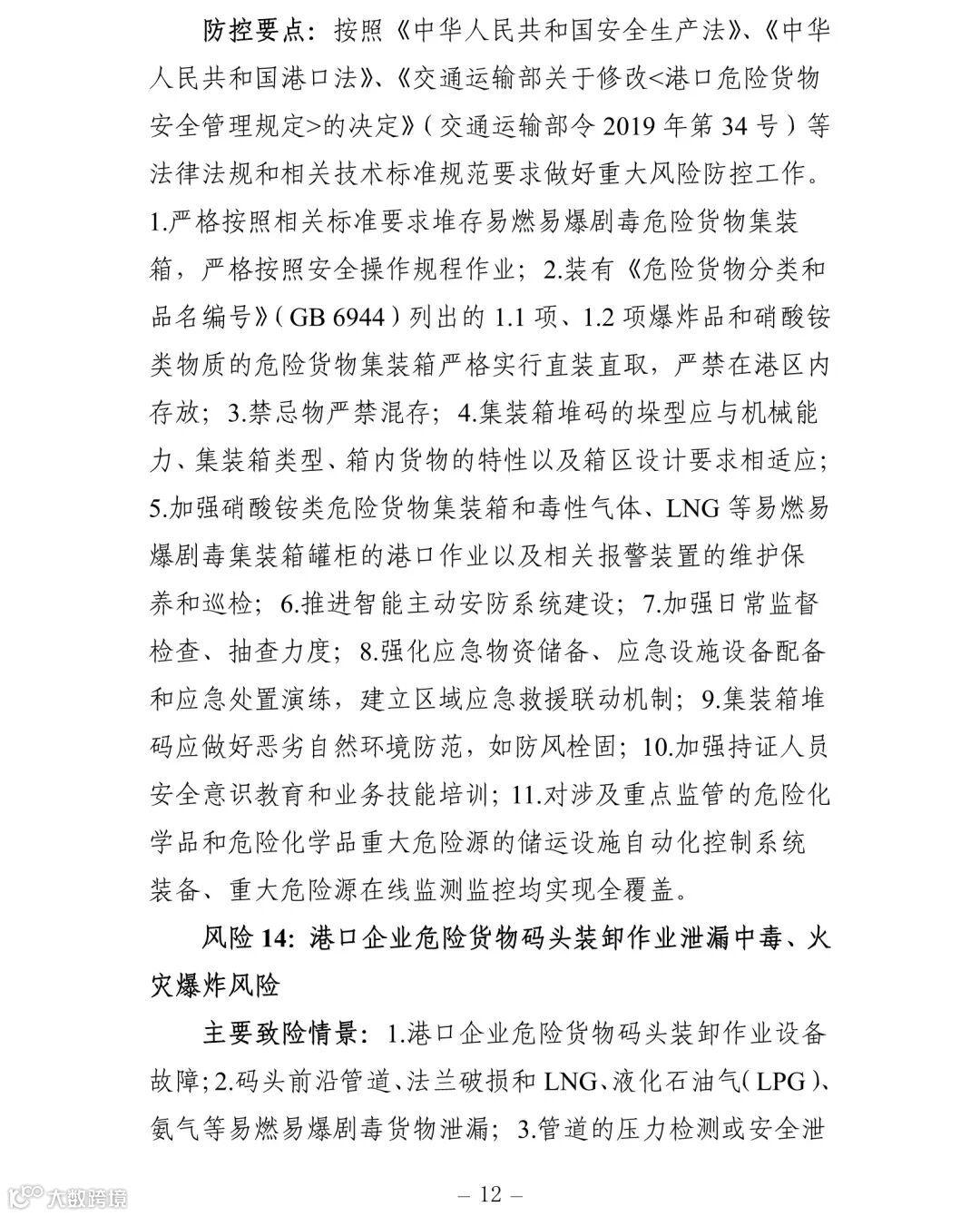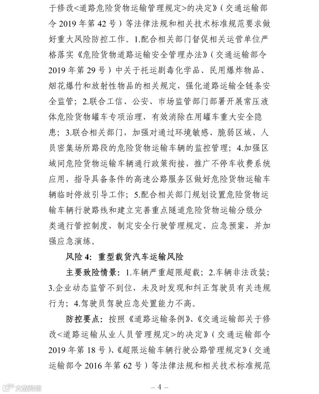 (一)建立健全安全风险研判机制。要认真对照《交通运输安全生产重大风险清单》(见附件)明确的42项重大风险,结合地方实际情况,适时调整和补充重大风险清单,针对行业安全生产风险系统性、区域性、多发性和偶发性特征,加强安全生产形势研判。要围绕行业安全发展变化趋势、环境影响因素、风险规律、事故教训和突出问题等重点,加强调研,定期会商,充分利用大数据等信息化手段,科学研判,及时准确发现潜在重大风险和系统性、区域性、倾向性、苗头性问题,精准提出应对方案和具体措施。