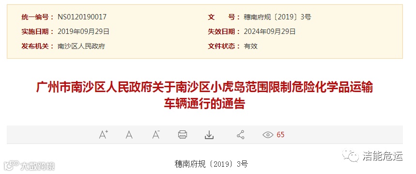 (1)《关于南沙区小虎岛范围限制危险化学品运输车辆通行的通告》(穗南府规〔2019〕3号)
