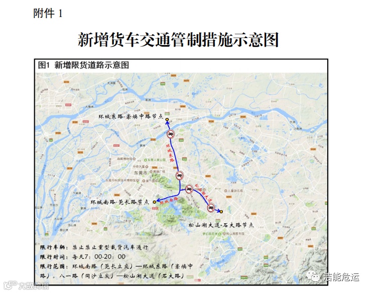 5.环城南路(莞长立交)—环城东路(崇焕立交),八一路(同沙立交)—松山湖大道(石大立交)路段,每天7:00-20:00禁止重型载货汽车通行。
