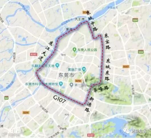 1.东宝路—东城东路—翠峰路—新源路—G107国道一东江大道—东城中路—莞龙路—东宝路连接范围以内(不含上述边界道路),每天7:00-9:00、16:00-20:00禁止载货汽车通行。