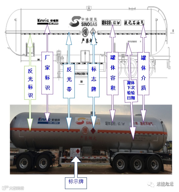 2)厂家标识、罐体容积、罐体介质应清晰可见(字体、设置等位置在出厂时已确定),且应与登记证书和车辆行驶证信息一致;罐体下次检验日期应喷涂在有效期内的日期。