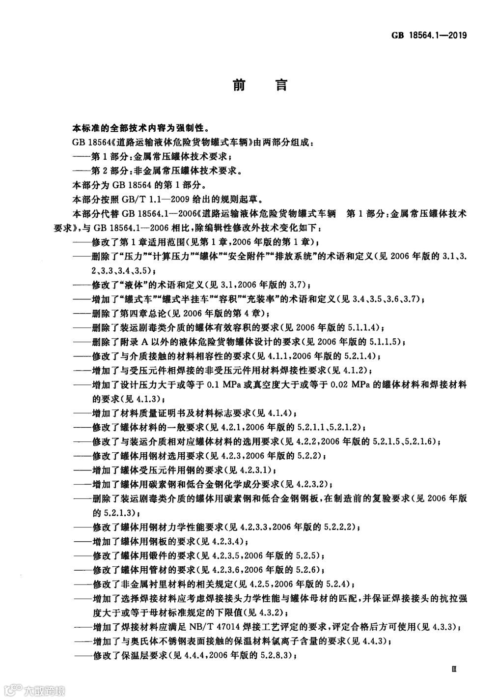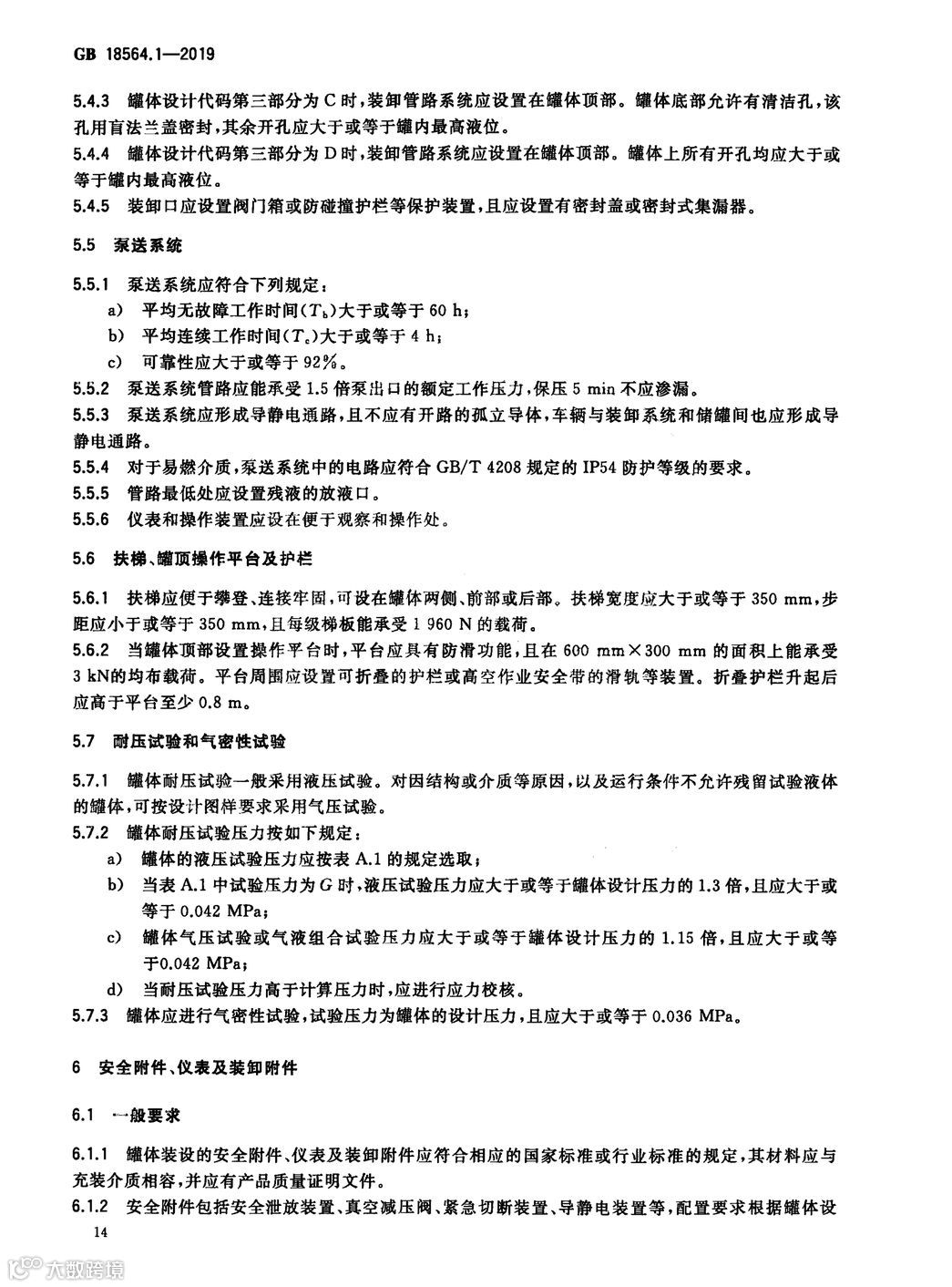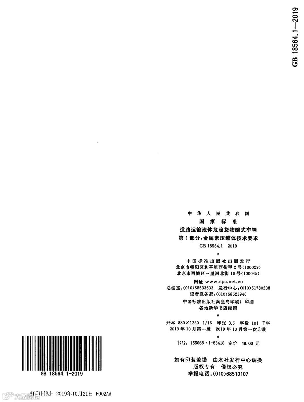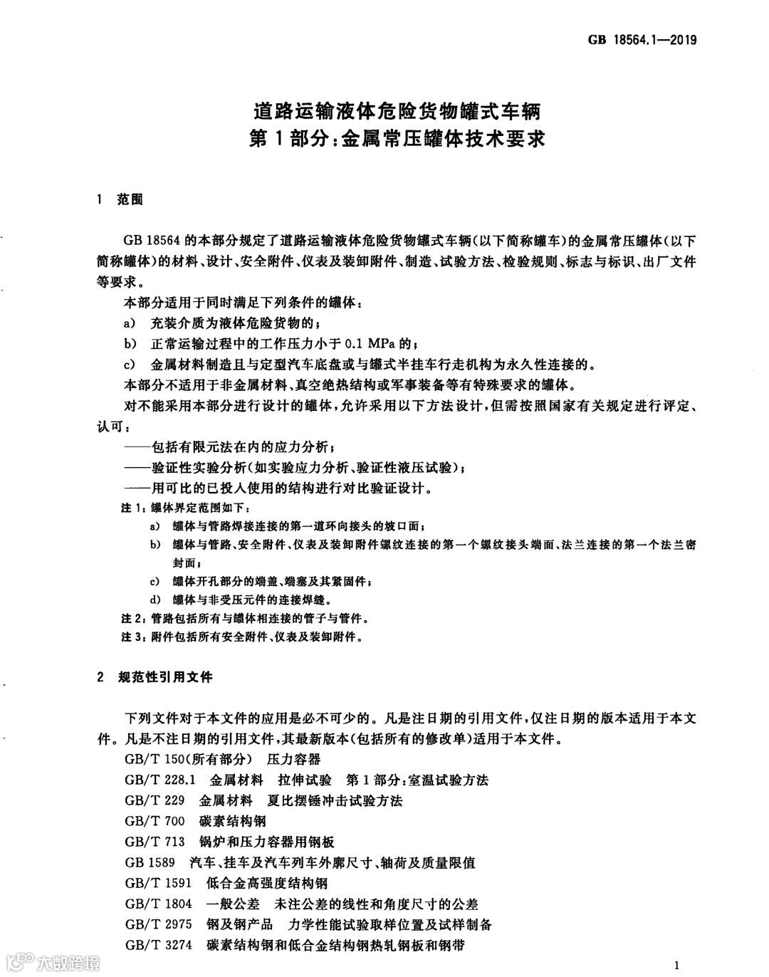 《GB18564.1-2019 道路运输液体危险货物罐式车辆第1部分:金属常压罐体技术要求》已于2019年10月14日发布,将于2020年1月1日实施。