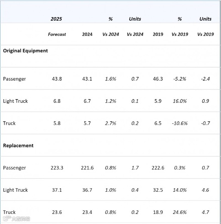 与2024年相比,乘用车、轻型卡车和卡车轮胎的原始设备(OE)出货量预计将分别增长1.6%、1.2%和2.7%,总计增加100万条;替换市场乘用车、轻型卡车和卡车轮胎的出货量预计分别增长0.8%、1.0%和0.8%,总计增加230万条。