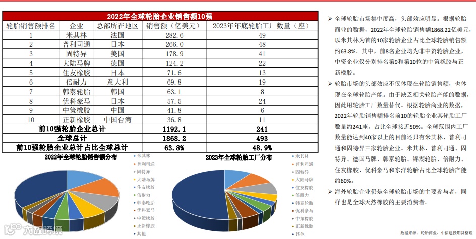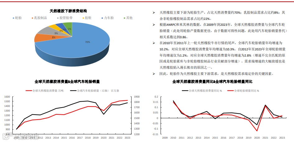 天然橡胶主要下游为轮胎生产,占比天然消费量约70%;乳胶制品需求占比约8%;其余非轮胎橡胶制品需求占比约22%。根据ANRPC和米其林的数据,在2009年到2023年,全球天然橡胶消费量与全球汽车轮胎销量在2010年至2011年上一轮天然橡胶牛市行情的尾声,全球汽车轮胎销量年均增速为10.2%,对应全球天然橡胶消费量年均增速为10.3%。自2012年至2023年全球轮胎销量年均增速仅为1.2%,对应全球天然橡胶消费量年均增速为2.8%需求端增速的大幅放缓也是天然橡胶陷入漫长熊市的原因之一。因此,轮胎作为天然橡胶主要下游需求,是天然橡胶需求端定价的关键因素。