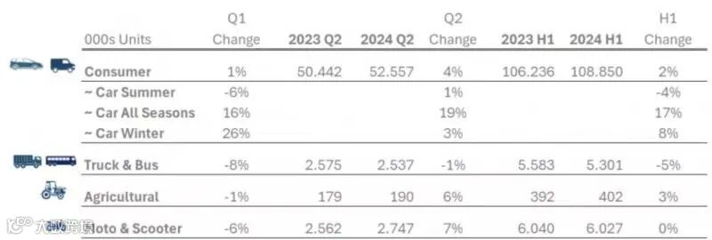 ETRMA秘书长表示,2023年全年消量下降8%,卡车销量下降17%(与2022年相比),之后2024年上半年销量有所改善,这主要得益于全季节细分市场,但卡车销量仍为负值。第二季度的表现好于第一季度,尽管通胀和地缘政治背景导致需求下降和库存水平下降。农业轮胎的销售受到雨天天气的支撑。