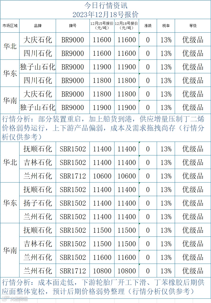2023年12月18号合成橡胶行情资讯