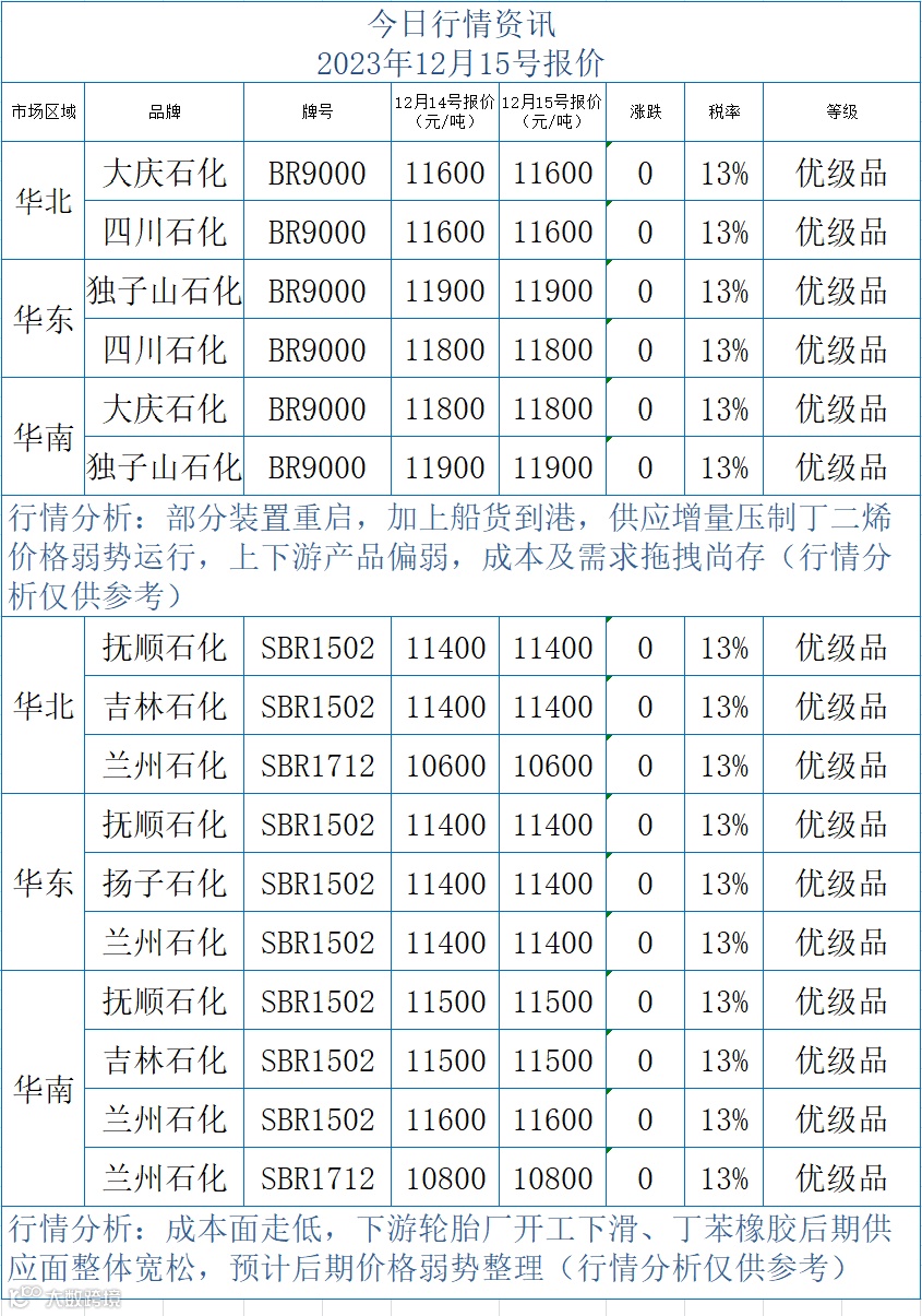 2023年12月15号合成橡胶行情资讯