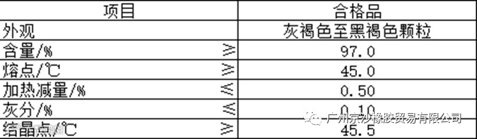 主要特征:熔点不低于45℃。溶于苯、丙酮、乙酸乙酯、二氯乙烷及甲苯,不溶于水。贮藏稳定,但温度超过35~40℃时慢慢结块,有毒。