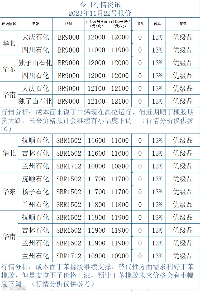 2023年11月21号合成橡胶行情资讯
