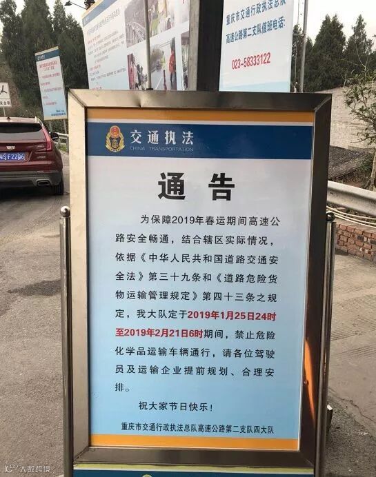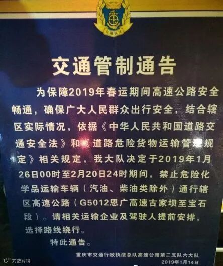 2019年1月25日24时至2019年2月21日6时期间,G42(沪蓉高速)禁止危险化学品运输车辆通行。(023-58333122)