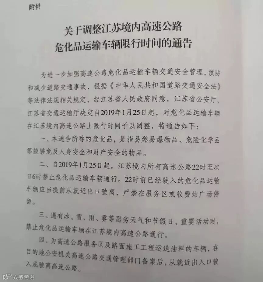 2019年1月25日起,江苏境内所有高速公路22时至次日6时禁止危险化学品运输车辆通行。22时前已经驶入的危险化学品运输车辆应当提前从就近出口驶离,严禁在服务区或收费站停留。