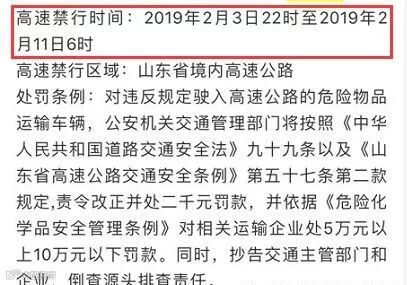 2019年2月3日22时至2月11日6时,全省高速公路禁止危险化学品运输车辆通行。
