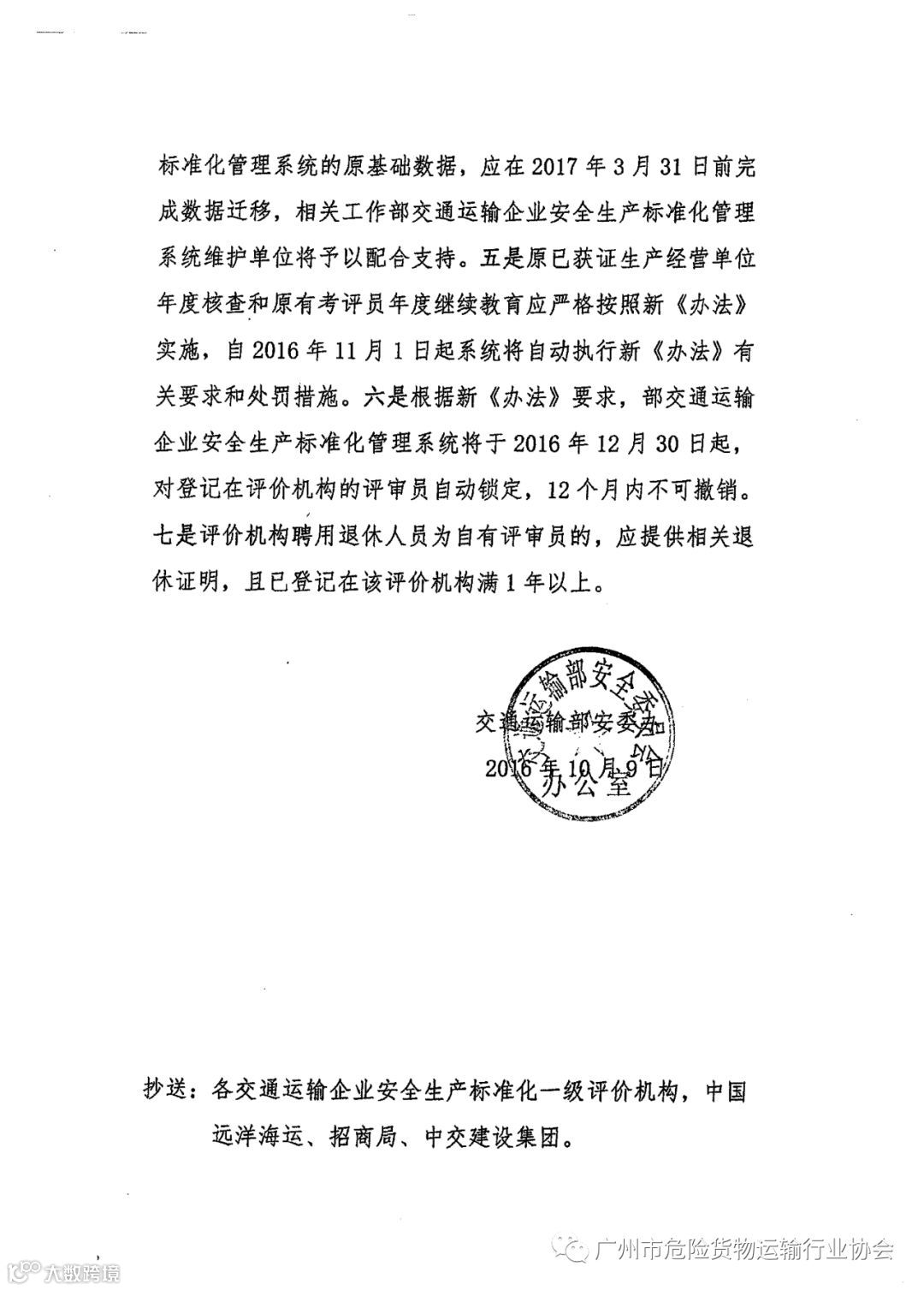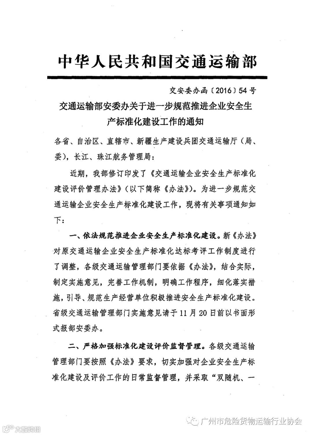 导读:交通运输部安委办关于进一步规范推进企业安全生产标准化建设工作的通知 交安委办函[2016]54号