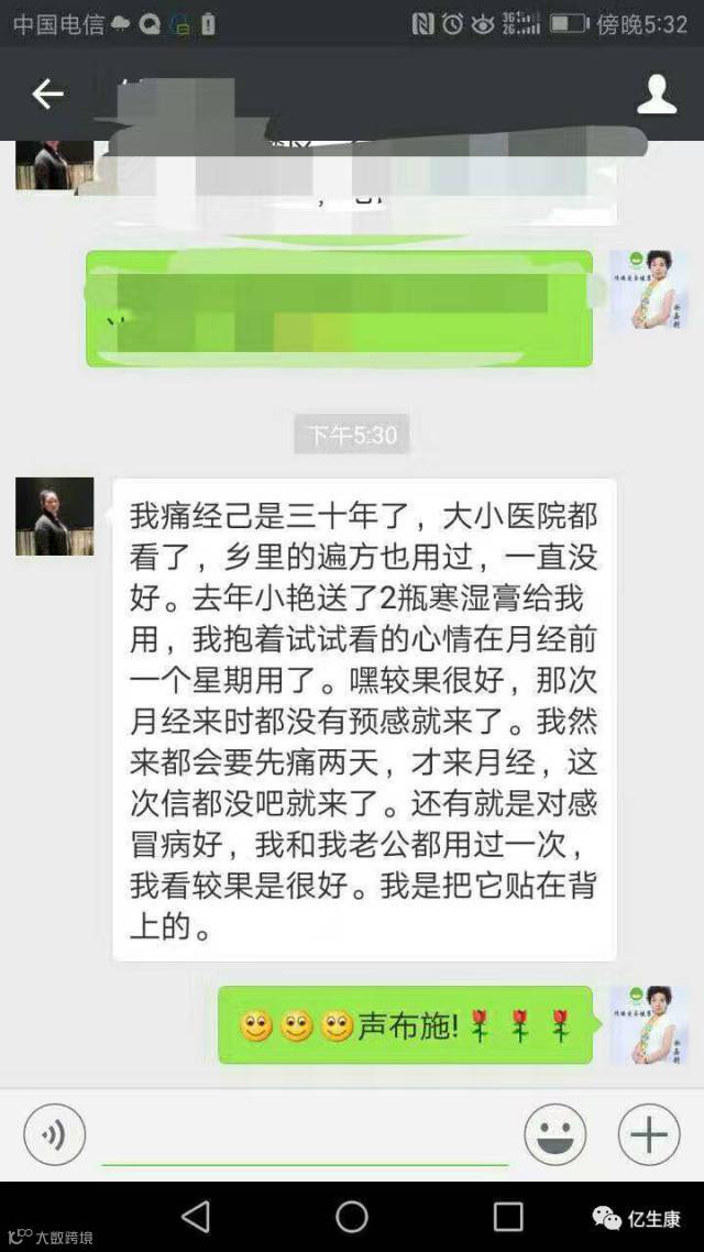 长沙钟女士30年痛经,看医生用过无数偏方,用媛泊馨祛寒湿膏(紧致膏)几次即不再痛经,现已成为代理。
