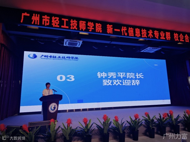 广州轻工技师学院院长钟秀平女士发表欢迎致辞为本次仪式拉开序幕,她表示学院坚持高质量发展、着力打造“轻工”特色的高水平专业集群,构建“一核引领、两个中心、多点带动”的6个专业集群布局;积极落实省、市关于服务“产业集群、链长制”的要求,不断开拓优质企业合作项目,达到校企需求“零距离”对接、校企共育高技能人才培养、“全方位”服务地方产业发展的双赢模式。