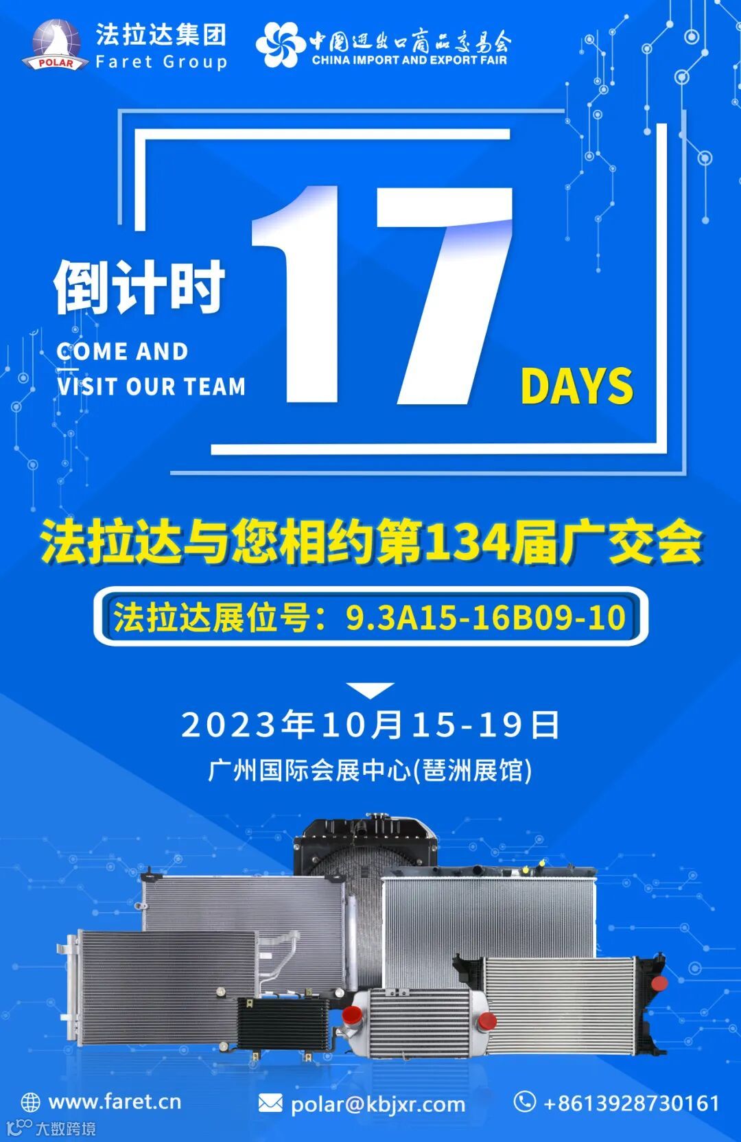 134届广交会交易会将于10月15日至19日在广州进出口交易中心举办,届时法拉达集团将携散热器、冷凝器、中冷器、油冷器等新品亮相,为您提供热管理系统一站式解决方案!我们诚挚邀请国内外客户朋友莅临9.3A15-16B09-10展位,一起携手共进,共商发展!