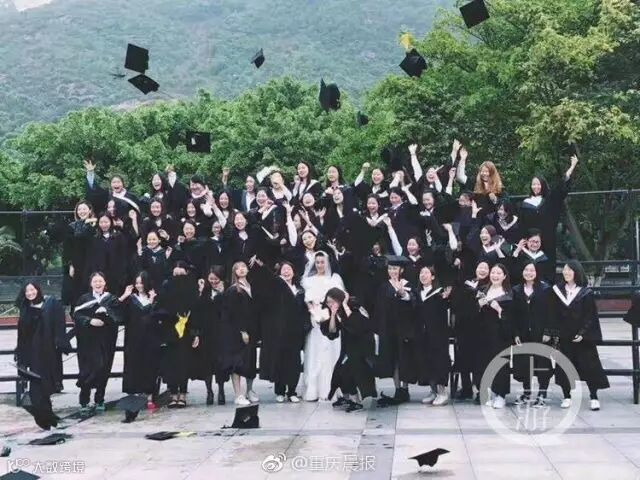 重庆文理学院旅游对口班用一种奇特的方式留念青春:53个女生清一色的学士服;全班唯一的男生则身穿婚纱,一脸娇羞。平时,只要女生们有什么需要帮忙的,田浪都会挺身而出。这次,为了满足全班女同学的愿望,他欣然答应拍一次反串照,毕业之前,“牺牲”一次,作为大学时光独特的留念。