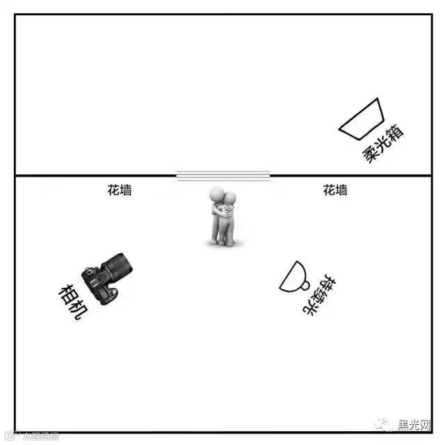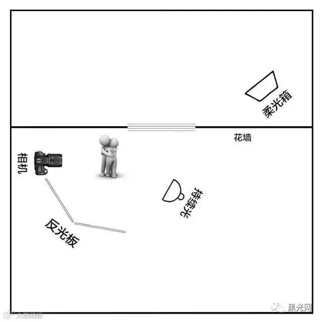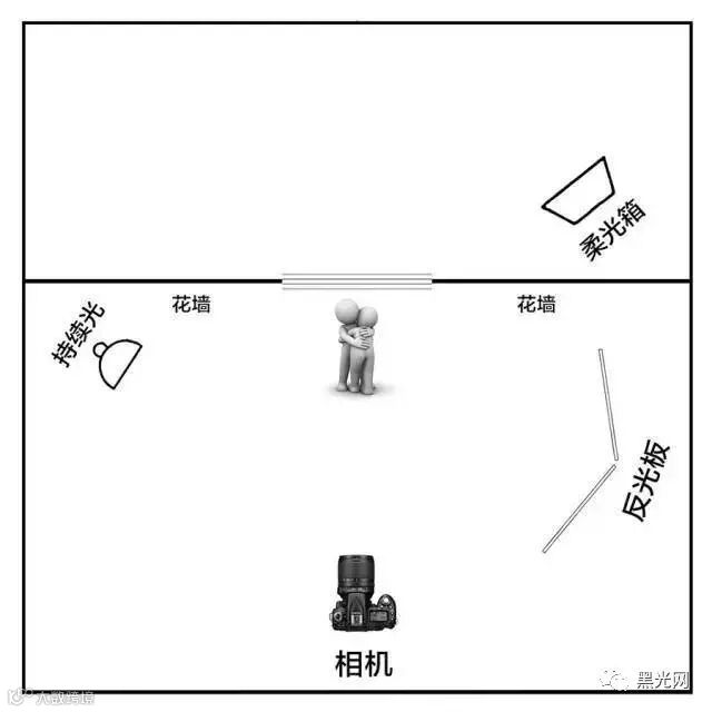 然后在人物左侧靠近花墙的位置放一只持续光源做为主光,让主光源的余光照向背景,使花墙更显立体感,同时也充当了背景光。在人物右侧放置两块反光板作为补光之用。