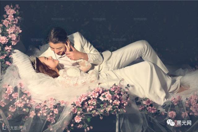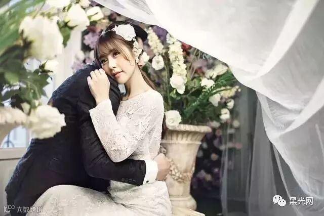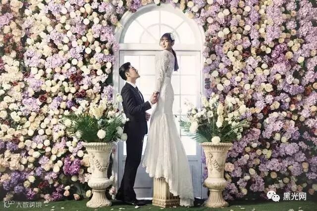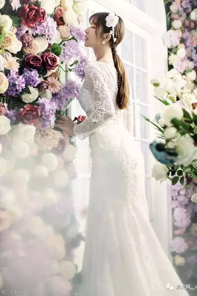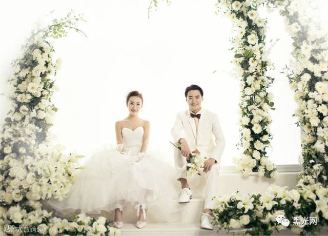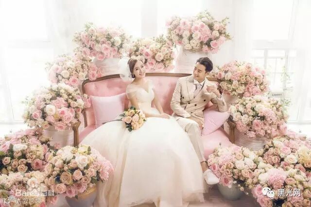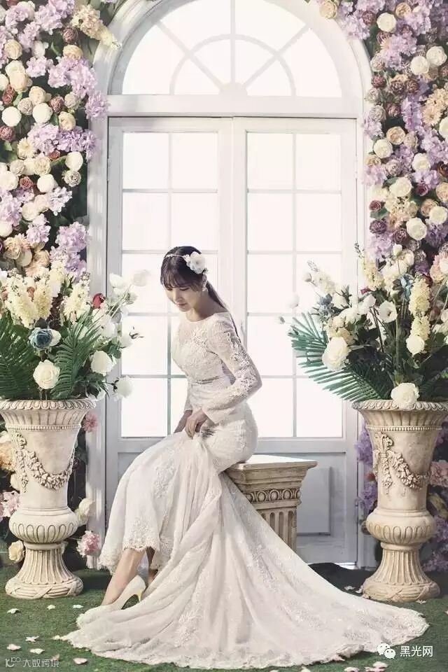 背景道具:韩式主婚纱照多选用渐变色和花纹素雅的扎染布或壁纸作为背景,常搭配花卉、花瓶、镜框等温馨的家居式道具。