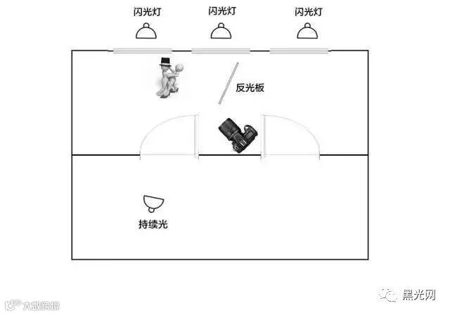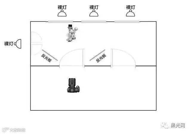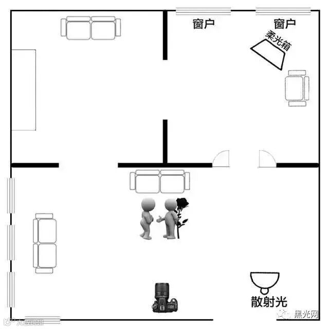 直接用一只持续光作主光源,把持续光置于窗户对面的大门外面,使之距离人物一定的距离。这样的目的是让主光源的照射面积扩大,让整个过道区域受光更为均匀。同时在人物右侧放置一大块反光板进行补光。