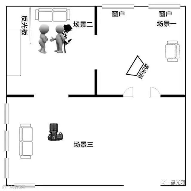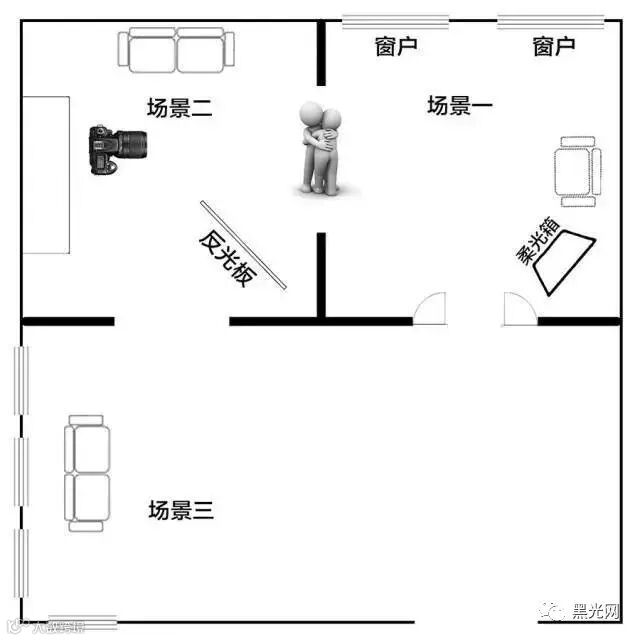 我们只需要把场景一中放置的柔光箱转向场景二即可,在人物暗部一侧再放置一块反光板,就完成了此场景的布光。