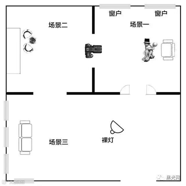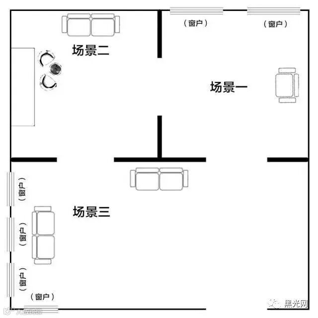 此处的过道实景有三个窗户,每个窗户里都有一只裸灯,可以用来营造户外光线效果。窗户的正对面是两扇带木格子的大门,过道两端是两扇玻璃门。在里我采用了三种光线手法来拍摄。