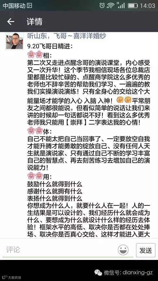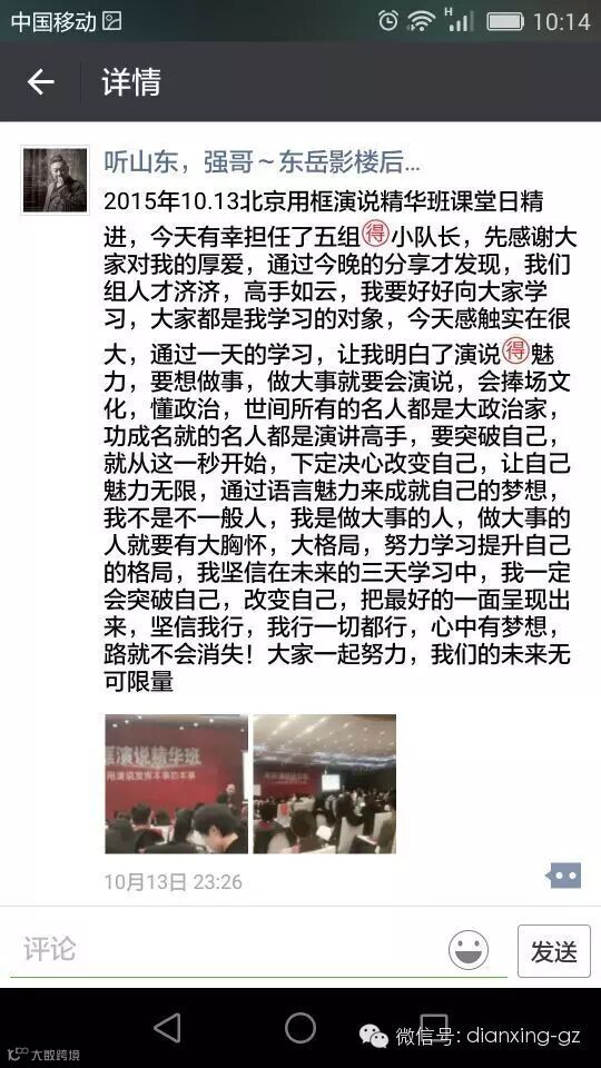我是做宝宝店的,以前的我是一个特别喜欢说话的人,甚至每次花钱请朋友吃饭都是我滔滔不觉,最让我痛苦的是公司每个月的结尾会,每次结尾会我们都是高管都躲着我,因为都是老三样重复几百遍,导致张总无比困惑直到上次朋友带他去上了李老师(演说精华班)回来,回来给员工开了4个小时的启动会,首先运用“神圣鼓励演说”模式让店长过去的辛苦得到所有人认可,店长非常开心、觉得这一切再苦再累都值得,有时候人更多需要精神认可!