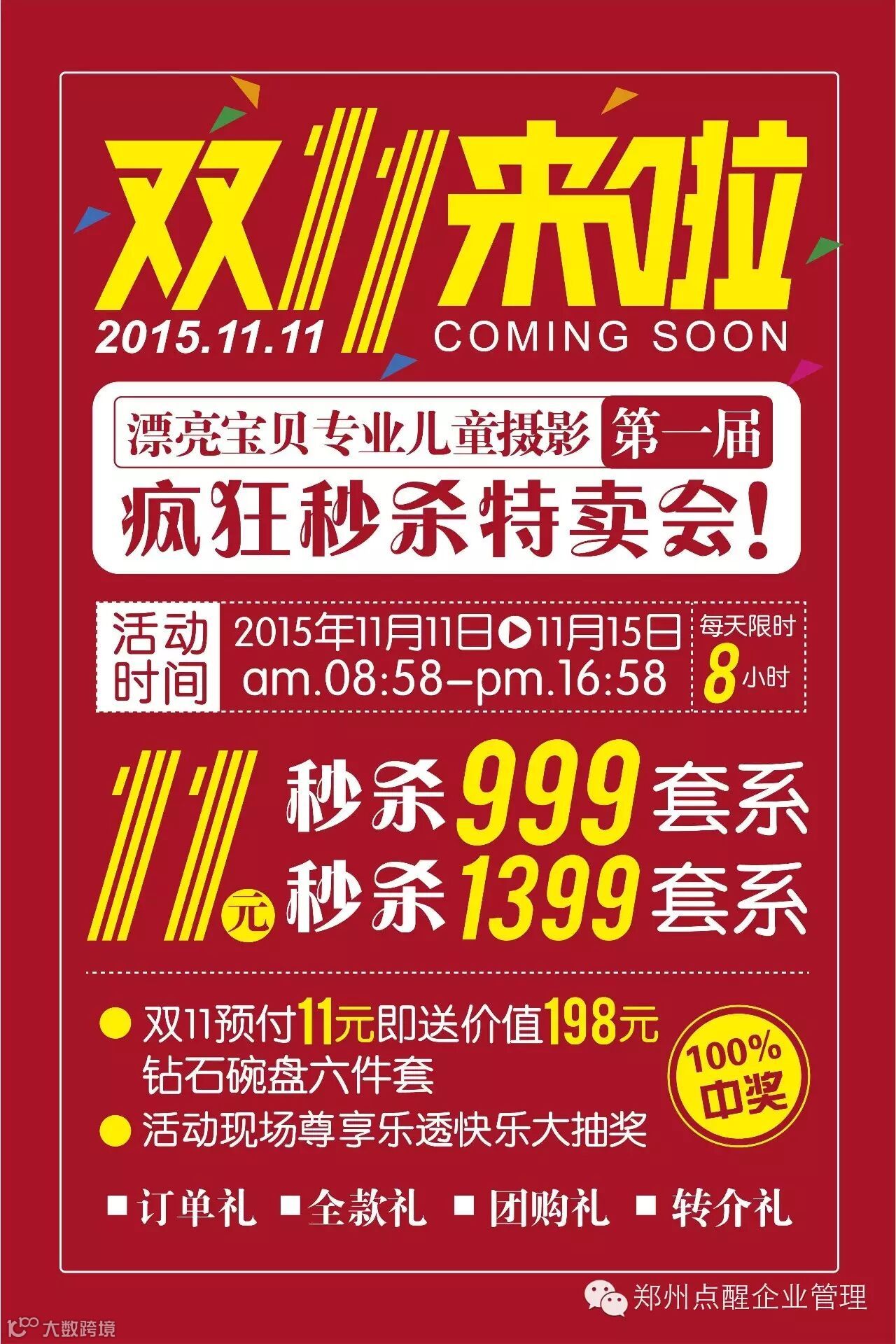 各位的群里的所有优秀总裁们大家晚上好,最近这段时间大家可能都关注双十一活动非常火爆,双十一来了,我跟很多朋友去聊天。大家都发现这个双十一我们做儿童的也想着跟着做一把活动。但是活动如何去做?我看了很多朋友都是为了做而做。所以,我想在这个群里面跟大家分享一下我做十六年以来,一直是在影楼里面在第一线做的一些活动的心得吧!