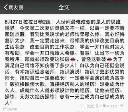2015年8月28日徐艳春日精进:我是一个经历过很多经历磨难的人,但是我从来没有认为很苦,因为我坚信生活给我的任何磨难都是要我把自己变的更好!两天的课程让我感受颇深,也明白了成功的捷径是先要度人!我一个人的小成功不算成功,我能带领一群人走向成功才是真正的成功,我特别渴望自己的演说能力以及自己的事业做到极致,想让老公真正的从店里解脱出来,也想让家人和村里的人我这样的人而感到骄傲,我一定要成为一个有钱又能力的人,我不想在因为没钱给家人看病而失去至亲的家人!更想学习好说话的本领带动家人和员工我们一起走向成功!我下定决心跟随各行业的老大们学习当真正的领导者!不想做侠女了!累个半死狗屁都不是,舍不得放下,总是不想放手,其实没有我地球同样还在转,而且转的更好的,我是个领导者而我还把自己框在一个打工者的框架里!一个人可以没有学历,绝对不能不学习!同样的在干一个行业为什么赵总、曹总,王总他们能做的那么好?我为什么不行?成功绝对不是偶然,一定有很多方法!这两次的学习已经让我所领悟,没有一个完善的管理机制企业很难做强做大。我为了那么多相信我的人,我一定要努力学好挣钱的本领,从井底跳出来好好看看外面的世界!感谢点醒这个平台真的叫醒了沉睡了这么多年的我,走了如此多弯路的我!真的好感谢!!好爱你们!