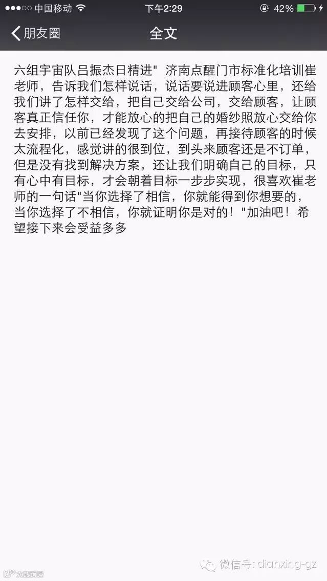 六组宇宙队吕总日精进:济南点醒门市标准化培训催老师,告诉我们怎样说话,说话要进客户心理,还给我们讲了怎样交给,把自已交给公司,交给顾客,让顾客真正信任你,才能放心的把自已的婚纱照放心交给你去安排,以前已经发现了这个问题,再接待顾客的时候太流程化,感觉讲的很到位,到头来顾客还是不订单,但是没有找到解决方案,还让我们明确自已的目标,只有心中有目标,才会朝着目标一步步实现,很喜欢催老师的一句话,当你选择了相信,你就能得到你想要的,当你选择了不相信,你就证明你是对的!加油吧!