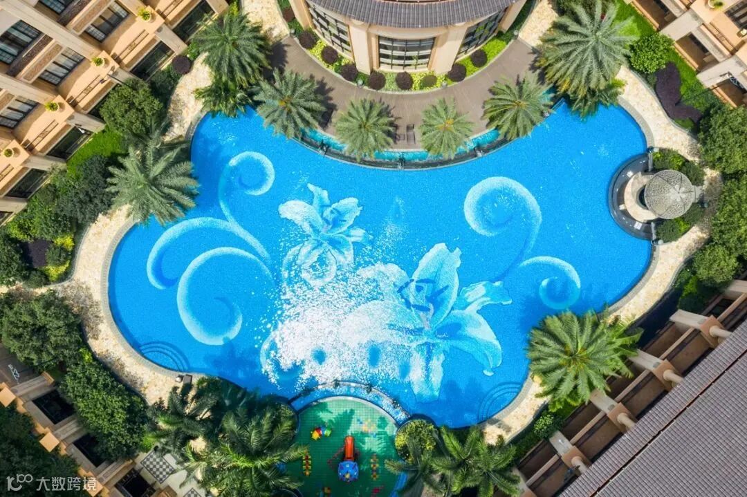 标志性的拼花景观池,采用了对施工要求相当高的大圆弧线池壁设计;泳池四周种植银海枣、双杆、三杆等名贵树种,营造出泳池与周边绿植自然流畅的热带风情景观。