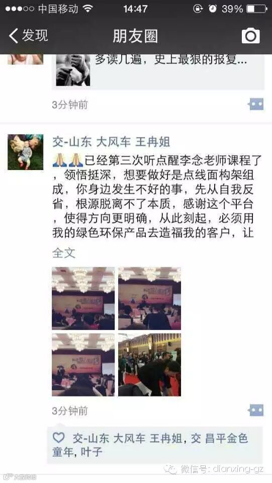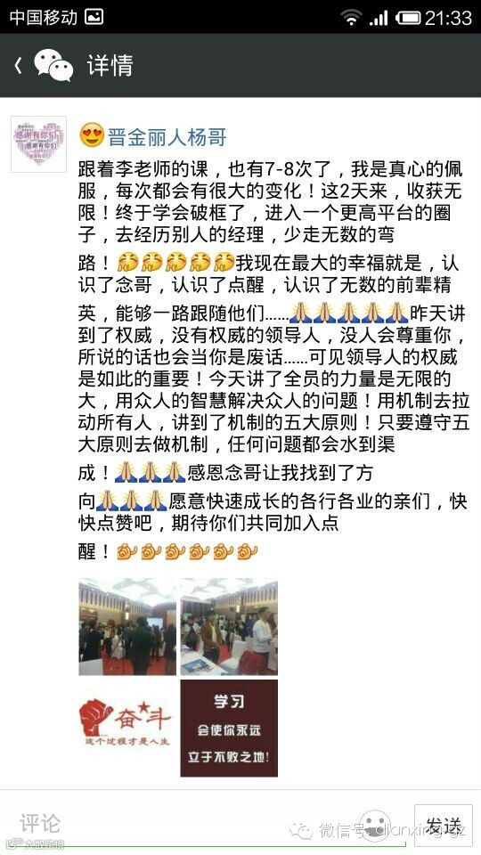 [玫瑰][玫瑰][玫瑰]第一次走进点醒的课堂,是朋友介绍的,对念哥也一无所知,但是真正用心去听念哥的课了以后,就一个字:值!原来的我经常会放毒气,[快哭了]因为我遇到问题会抱怨,会找对方原因,但是现在我懂了,,我要学会破框,我要壮大自己,增强我自身的质量,我的学习和改变的速度不能慢于员工成长的速度,我要给员工支起足够高的时空,厚德载物,权威远远大于权力![调皮]我要学会经营智慧,健康和幸福!想成为什么样的人就和什么样的人在一起,圈子很重要!