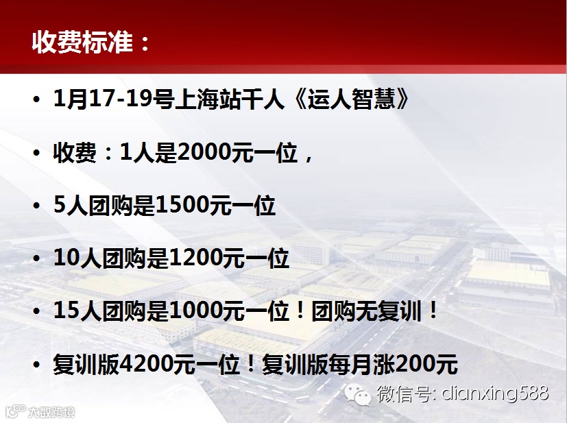 收费:6200元一位,团队5人才可参加!