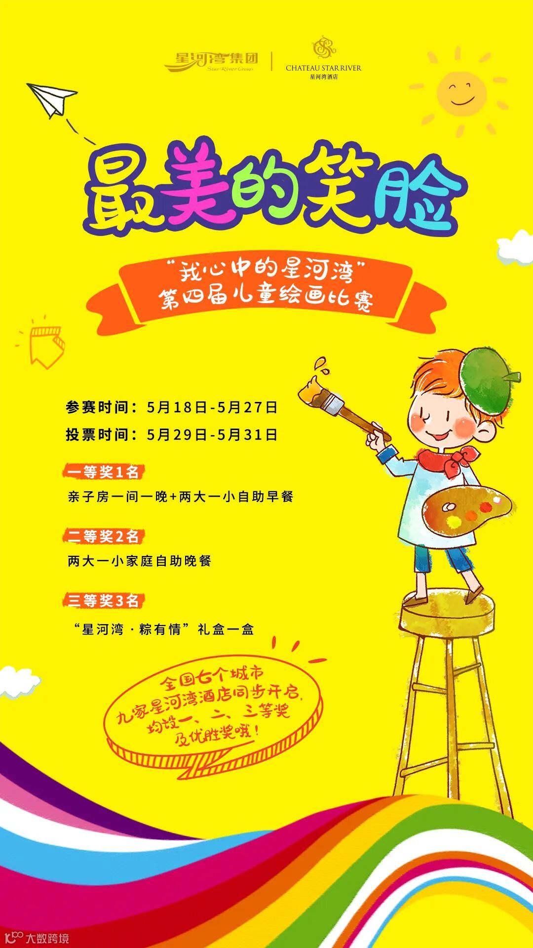 本次儿童绘画大赛,全国七个城市九家星河湾酒店同步开启,分别独立设了一、二、三等奖,及优胜奖。