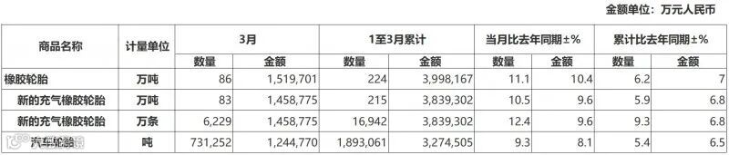 1-3月汽车轮胎出口量为189万吨,同比增长5.4%;出口金额为327亿元,同比增长6.5%。