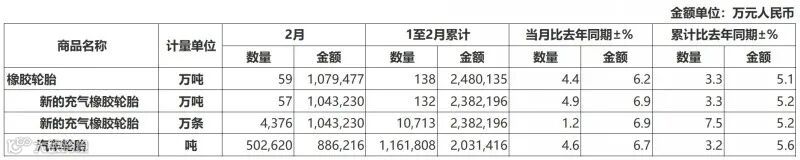 1-2月汽车轮胎出口量为116万吨,同比增长3.2%;出口金额为203亿元,同比增长5.6%
